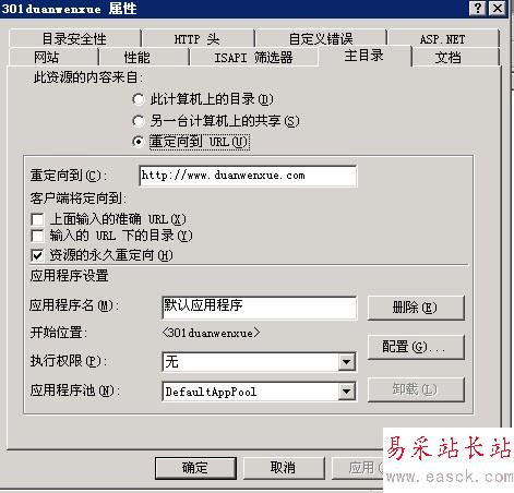 2.在IIS中選中剛才我們建立的站點,右鍵,屬性,主目錄,選擇重定向到,輸入網址如:http://www.xxxx.com,同時注意選中下面的資源的永久重定向選項。如下圖: