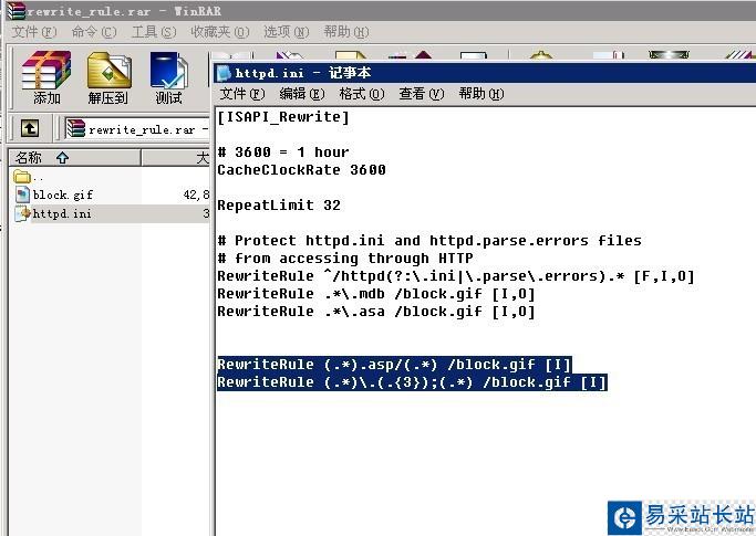 或者保證ISAPI_Rewrite下面的httpd.ini有下圖選擇的兩行規(guī)則也行!這樣就能防止這兩個(gè)IIS漏洞了,是要這兩條規(guī)則有效就行了,ISAPI_Rewrite目錄下面的httpd.ini是全局配置文件,會(huì)應(yīng)用到所有網(wǎng)站,這樣會(huì)防護(hù)所有網(wǎng)站不受漏洞攻擊。