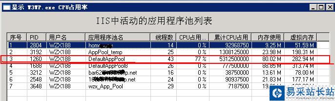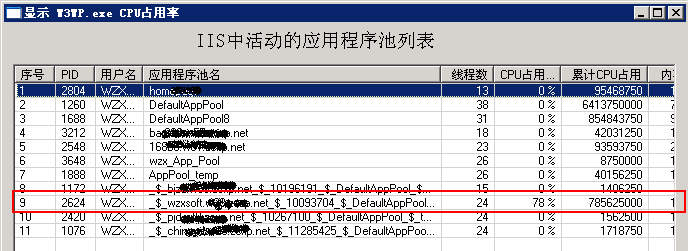 有一個應用程序池,cpu占用率長時間高達 70-80%,累計CPU站用時間也特別高