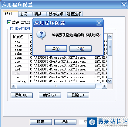 在新彈出的對話框中選擇是,則該類型的腳本映射被刪除,IIS將不會再用asp.dll組件來解析.cdx后綴的文件了。