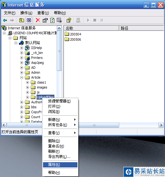 首先,打開IIS并找到上傳文件的目錄,并按右鍵,選擇屬性欄