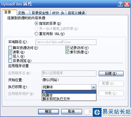 在新開的屬性窗口中選擇執行權限為”無”并點擊確定,這樣就指定該目錄不進行任何的腳本映射和文件執行。
