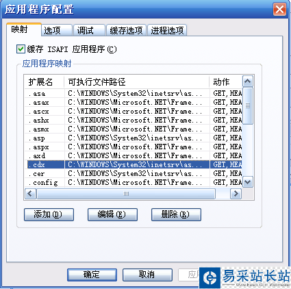 在新開的配置窗口中,我們可以看到各種后綴名,這些都是IIS可以執行的文件名稱后綴,名稱后面的欄目中說明了這種類型的文件,會由那個組件來解析執行它。