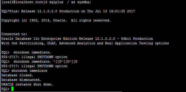 關閉數據庫, 輸入命令: shutdown immediate;