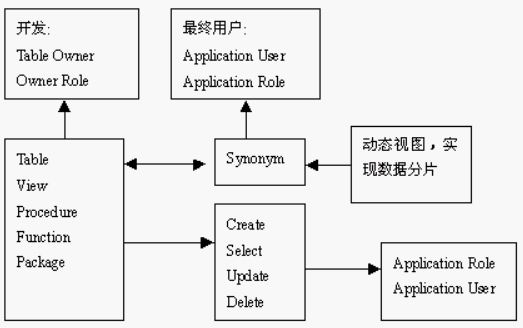 (2) 數據分片技術 首先要說明的是什么是數據分片。在oracle的用戶權限分配中,只提供對表、函數、同義詞、視圖、包等的insert,update,select,delete,execute等操作,并未提供字段級的權限設置(實際上,對大型數據庫進行字段級的權限設置雖然帶來了安全性方面的好處,但對于性能的存在一定的影響),因此,對于大型mis系統,進行數據的分片是在所難免的。 一般地,一個典型的mis數據庫平臺設計是這樣的,如圖2。