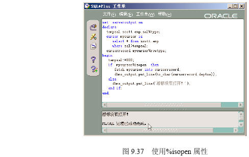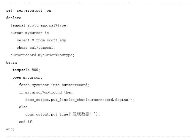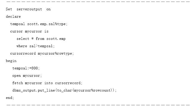 游標作為一種數據類型,首先必須進行定義,其語法如下。 cursor 游標名 is select 語句; cursor是定義游標的關鍵詞,select是建立游標的數據表查詢命令。 以scott用戶連接數據庫,在【sqlplus worksheet】中執行下列pl/sql程序,該程序定義tempsal為與scott.emps數據表中的sal字段類型相同的變量,mycursor為從scott.emp數據表中提取的sal大于tempsal的數據構成的游標。 執行結果如圖9.35所示。 ――――――――――――――――――――――――――――――――――――― set serveroutput on declare tempsal scott.emp.sal%type; cursor mycursor is select * from scott.emp where sal>tempsal; begin tempsal:=800; open mycursor; end; ――――――――――――――――――――――――――――――――――――― 【配套程序位置】:第9章/ cursordefine.sql。 打開游標