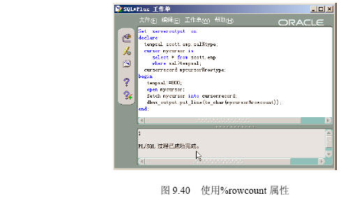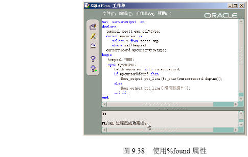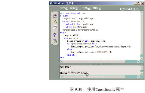 游標提供的一些屬性可以幫助編寫pl/sql程序,游標屬性的使用方法為:游標名[屬性],例如mycursor%isopen,主要的游標屬性如下。 1. %isopen屬性 該屬性功能是測試游標是否打開,如果沒有打開游標就使用fetch語句將提示錯誤。 在【sqlplus worksheet】中執行下列pl/sql程序,該程序利用%isopen屬性判斷游標是否打開。執行結果如圖9.37所示。 ――――――――――――――――――――――――――――――――――――― set serveroutput on declare tempsal scott.emp.sal%type; cursor mycursor is select * from scott.emp where sal>tempsal; cursorrecord mycursor%rowtype; begin tempsal:=800; if mycursor%isopen then fetch mycursor into cursorrecord; dbms_output.put_line(to_char(cursorrecord.deptno)); else dbms_output.put_line('游標沒有打開!'); end if; end; ――――――――――――――――――――――――――――――――――――― 【配套程序位置】:第9章/ isopenattribute.sql。 2. %found屬性 該屬性功能是測試前一個fetch語句是否有值,有值將返回true,否則為false。 在【sqlplus worksheet】中執行下列pl/sql程序。該程序利用%found屬性判斷游標是否有數據。 執行結果如圖9.38所示。 ――――――――――――――――――――――――――――――――――――― set serveroutput on declare tempsal scott.emp.sal%type; cursor mycursor is select * from scott.emp where sal>tempsal; cursorrecord mycursor%rowtype; begin tempsal:=800; open mycursor; fetch mycursor into cursorrecord; if mycursor%found then dbms_output.put_line(to_char(cursorrecord.deptno)); else dbms_output.put_line('沒有數據!'); end if; end; ――――――――――――――――――――――――――――――――――――― 【配套程序位置】:第9章/ foundattribute.sql。 3. %notfound屬性 該屬性是%found屬性的反邏輯,常被用于退出循環。 在【sqlplus worksheet】中執行下列pl/sql程序。該程序利用%notfound屬性判斷游標是否沒有數據。 執行結果如圖9.39所示。 【配套程序位置】:第9章/ notfoundattribute.sql。 4. %rowcount屬性 該屬性用于返回游標的數據行數。 在sqlplus worksheet的【代碼編輯區】執行下列pl/sql程序,該程序利用%rowcount屬性判斷游標數據行數。 執行結果如圖9.40所示。 【配套程序位置】:第9章/ rowcountattribute.sql。 若返回值為0,表明游標已經打開,但沒有提取出數據。