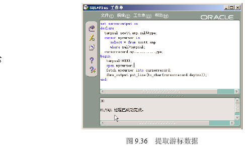 要提取游標中的數據,使用fetch命令,語法形式如下。 fetch 游標名 into 變量名1, 變量名2,……; 或 fetch 游標名 into 記錄型變量名; 在【sqlplus worksheet】中執行下列pl/sql程序,該程序定義cursorrecord變量是游標mycursor的記錄行變量,在游標mycursor的結果中找到sal字段大于800的第一個記錄,顯示deptno字段的內容。 執行結果如圖9.36所示。 ――――――――――――――――――――――――――――――――――――― set serveroutput on declare tempsal scott.emp.sal%type; cursor mycursor is select * from scott.emp where sal>tempsal; cursorrecord mycursor%rowtype; begin tempsal:=800; open mycursor; fetch mycursor into cursorrecord; dbms_output.put_line(to_char(cursorrecord.deptno)); end; ――――――――――――――――――――――――――――――――――――― 【配套程序位置】:第9章/ cursorfetch.sql。