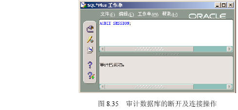 (1)以system用戶登錄【sqlplus worksheet】,執(zhí)行如下sql代碼,執(zhí)行結(jié)果如圖8.35所示。 ――――――――――――――――――――――――――――――――――――― audit session; ――――――――――――――――――――――――――――――――――――― 【參見(jiàn)光盤(pán)文件】:第8章/auditsession.sql。