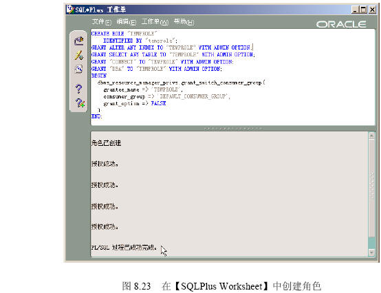 (1)在【sqlplus worksheet】中直接執(zhí)行createrole.sql文件將完成角色的創(chuàng)建,執(zhí)行結(jié)果如圖8.23所示。