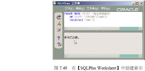 (9)讀者也可以直接在【sqlplus worksheet】中執(zhí)行createindex.sql文件完成索引的創(chuàng)建,如圖7.49所示。