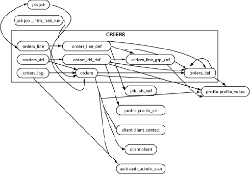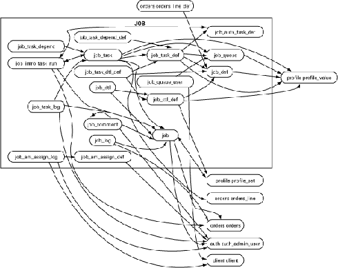 這些模式示意圖看起來很復雜,當然,它們的確很復雜。不過,如果把它們分開,使得只出現原型表(以 _def 結束的表),那么該體系結構的基本結構就變得很清楚了。訂單由行組組成,這些行組包括詳細信息、訂單行或兩者。訂單行可以隨意地創建作業,作業由一個任務序列組成,并且包含幾條詳細信息。必需要為各種任務輸入這些詳細信息。任務出現在不同的隊列中,這些隊列可以由不同部門的特定用戶進行訪問。