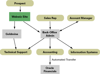 該圖顯示了通向新的訂單系統的所有信息路徑,新的訂單系統位于后端的門戶管理站點。所有的初始數據輸入都僅一次性完成,并且只需要每個小組在處理的各個階段驗證數據。通過引入從訂單系統到帳目管理系統的自動數據傳輸,至關重要的數據傳輸的另一個主要的領域也變為自動化。