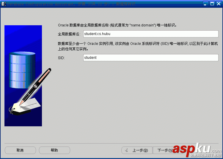 (4)單擊“下一步”按鈕,出現“數據庫標識”窗口,并輸入全局數據庫名:student,SID:student.cs.hubu,如圖4: