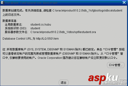 (17)在數據庫創建完成窗口中,單擊“退出”按鈕,退出DBCA。到此,DBCA創建數據庫的操作就結束了。