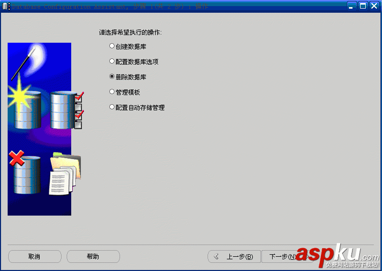 (2)單擊“下一步”按鈕,出現“操作”窗口,并選擇“刪除數據庫”,如圖19: