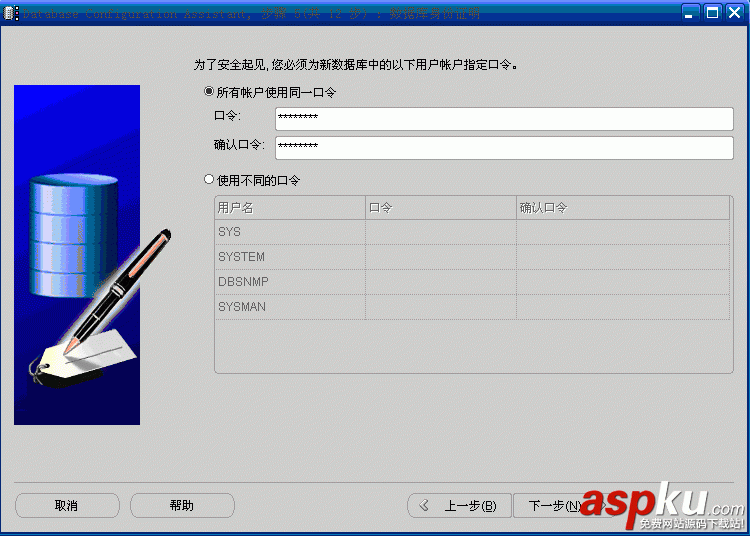 (6)單擊“下一步”按鈕,出現“數據庫身份證明”窗口,選擇“所有帳戶使用同一口令”,并輸入密碼:password,如圖6: