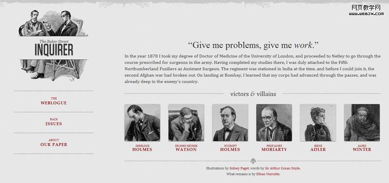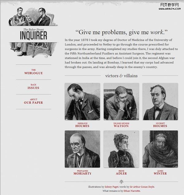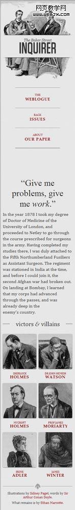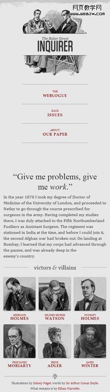 他制作了一個范例,里面是《福爾摩斯歷險記》六個主人公的頭像。如果屏幕寬度大于1300像素,則6張圖片并排在一行。