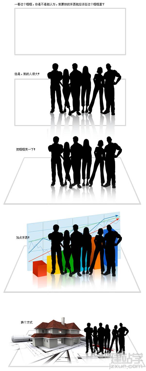 其實很簡單,把思維習慣反過來即可。一般情況下,比如某個人,是在限定的一個區域內。那么,我們把它們反過來,讓人物的體積大于區域,讓人物顯示正常,讓區域進行透視!