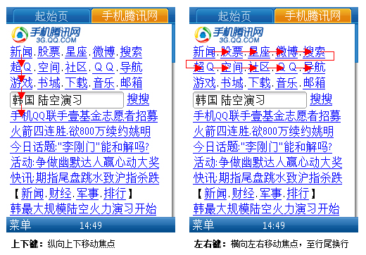 2. 鍵盤機的第二個特征決定了用戶必須遵循既定的規則來移動焦點,例如:方向鍵、搖桿、滾輪、撥盤(BlackBerry)。正因為如此,我們在設計的時候,必須思考頁面鏈接元素之間的內聯關系,仔細計算用戶的焦點移動軌跡。重要的信息最好是放在每一行起始位置。