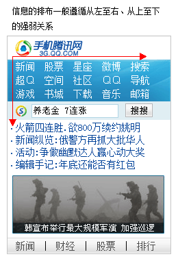 1. 可視區域大,決定了頁面承載的信息量也比鍵盤機要多?,F在市場上主流的觸屏手機分辨率為320*480,屏幕寬度最低也是240。這時,如果將適配鍵盤機的WAP頁面放到觸屏機上來看,會出現大面積“被留白”的情況,視覺上將帶給用戶松散的感受。這時我們可以將240px作為基礎寬度進行設計。