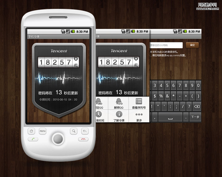 對于令牌主頁面的全擬物風格,如何適應這些不同的分辨率,我們也做了統一適配處理:我們先采用了木材背景填充頁面所有位置,針對不同的分辨率,程序先檢測手機分辨率,然后針對不同的分辨率,將盾牌擺放在不同的高度。當然,高度還要充分考慮到menu鍵呼出option菜單后的效果,大家可以留意下不同手機看到的盾牌距離狀態欄的距離,如下圖所示: