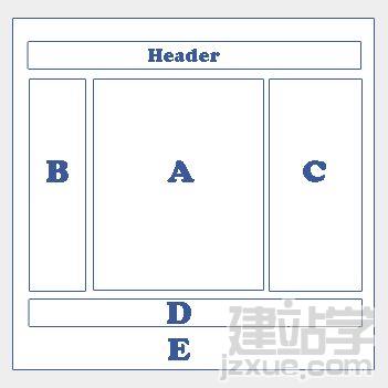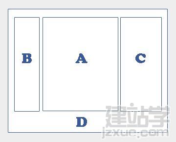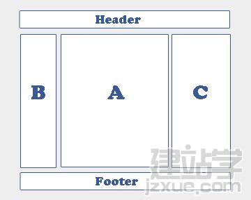 但是,我們常用的布局并沒有這么簡單,除了三欄之外,我們還需要一個頁頭和一個頁腳,如下圖: