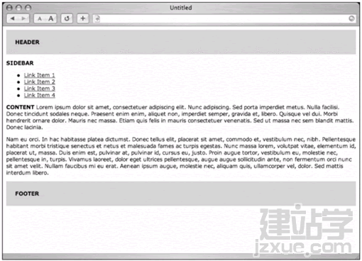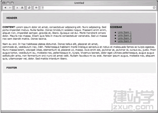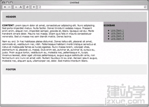 我們會發現,我們給content設定的右外補丁大小比#sidebar還大4%,如此能在兩欄之間留下一點空位.圖12-4是以瀏覽器查看的效果,你可以發現只要為<div>設定右外補丁,就能造出第二欄的假象.