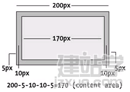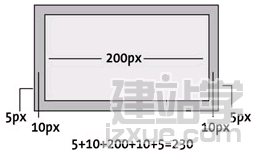 比較一下圖12-11和12-12,圖12-11是個200像素寬的元素,兩側各有10像素的內補丁,以及5像素的邊框,把水平部分的數值全加起來,就能知道實際寬度為230像素.