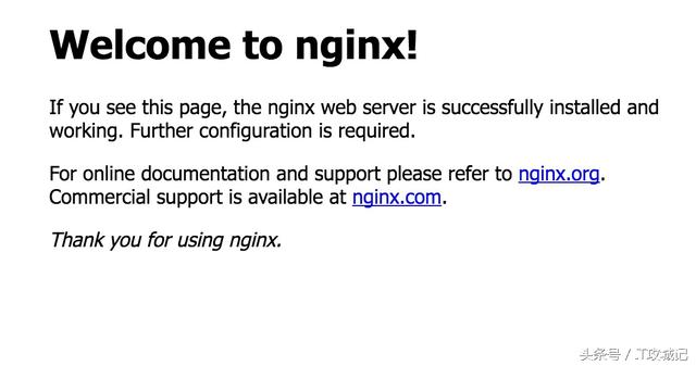 Nginx會默認安裝在/usr/local/nginx目錄,我們cd到/usr/local/nginx/sbin/目錄,存在一個Nginx二進制可執行文件。直接運行就可以啟動Nginx。運行成功后打開瀏覽器訪問此機器的IP,出現如下畫面即為成功。