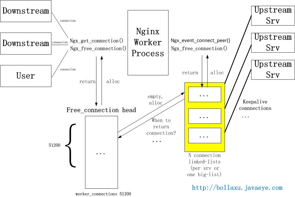 Nginx目前的upstream連接建立和獲取的機制如下圖。Nginx會在一開始創建connection pool(進程間不共享,可以避免鎖),提供給所有向前/后的連接。