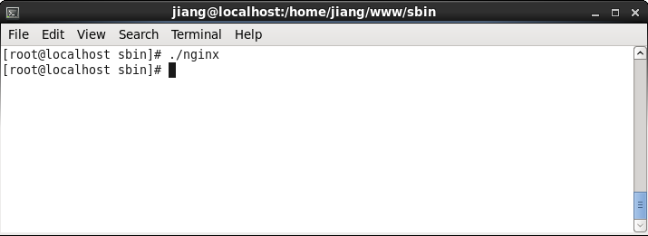 至此安裝成功,去安裝Nginx的基礎目錄下的sbin/,注意,我這里的目錄是/home/jiang/www/sbin,執行命令: