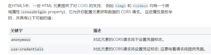 查閱MDN文檔(https://developer.mozilla.org/zh-CN/docs/Web/HTML/CORS_settings_attributes),可以發現crossOrigin有兩個取值
