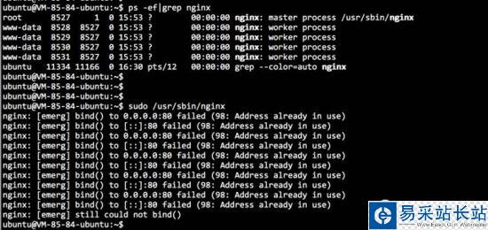 為了驗證nginx平滑重啟,筆者首先嘗試nginx啟動的情形下再次開啟一個新的server實例,結果如圖: