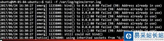 很明顯,重新開啟server實例是行不通的,原因在于新舊server使用了同一個端口80,在未開始socket reuseport選項復用端口時,bind系統調用會出錯。nginx默認bind重試5次,失敗后直接退出。而nginx需要監聽IPV4地址0.0.0.0和IPV6地址[::],故圖中打印出10條emerg日志。