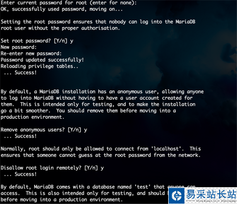 執行sudo yum install mariadb-server -y來安裝mariadb 啟動Mariadb并設置為開機自啟 a. sudo systemctl start mariadb b. sudo systemctl enable mariadb 執行sudo mysql_secure_installation來加固Mariadb。你會看到要求設置數據庫root密碼、移除匿名用戶、限制只能通過localhost登陸數據庫root用戶和移除test數據庫,這里推薦全部選Y(YES),如下圖所示,默認的數據庫root密碼為空