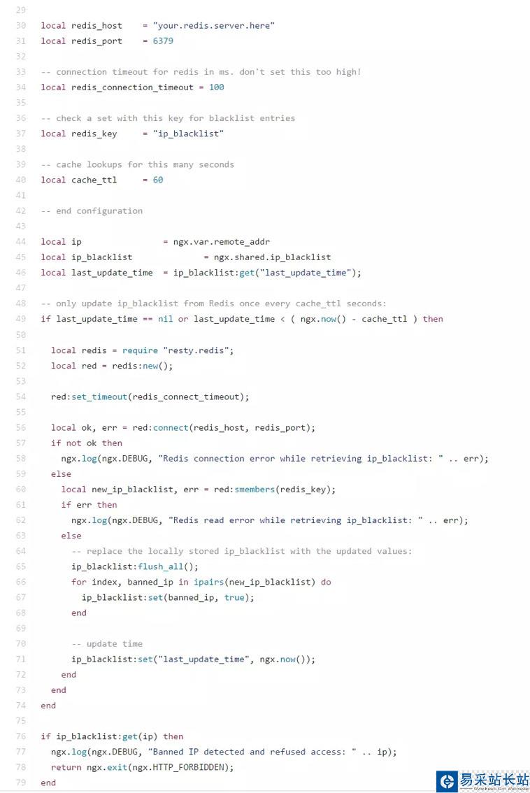 4、配置 lua 腳本,定期從 Redis 獲取最新的 IP 黑名單,文件內(nèi)容參見: