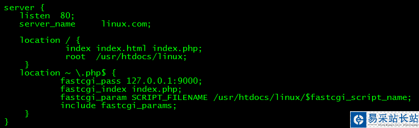 server { listen 80; //80端口 server_name linux.com; //設置域名 #直接輸入域名進入的目錄和默認解析的文件 location / { index index.html; root /usr/htdocs/linux; //直接輸入linux.com是進到了這里 ,一般配置和解析php所在目錄一直 } #解析.php的文件 location ~ /.php$ { fastcgi_pass 127.0.0.1:9000; fastcgi_index index.php; fastcgi_param SCRIPT_FILENAME /usr/htdocs/linux/$fastcgi_script_name; //當前虛擬主機對應的目錄 include fastcgi_params; } }在nginx.conf中添加