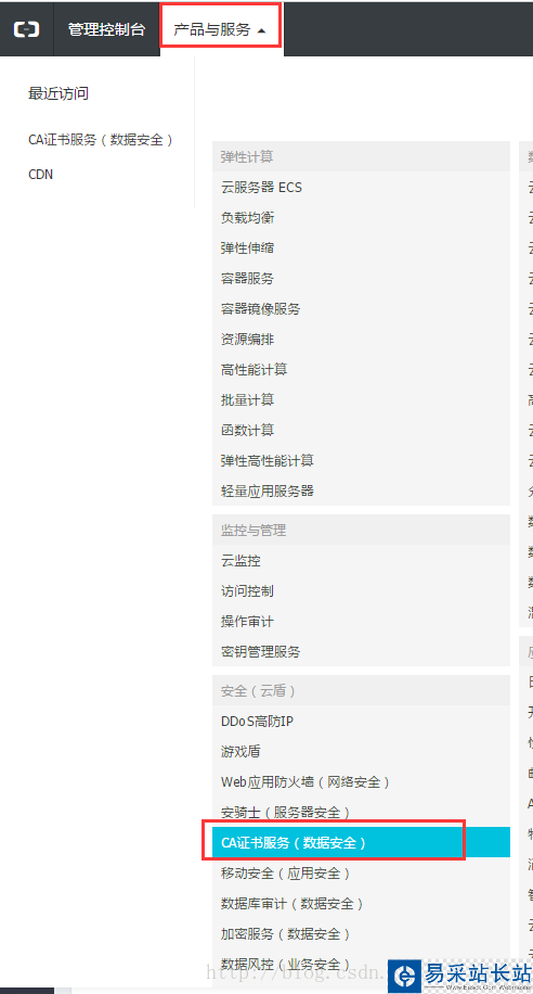 1. 登錄阿里云,選擇“控制臺”-“產(chǎn)品與服務(wù)”,在“安全(云盾)”一欄中選擇“CA證書服務(wù)(數(shù)據(jù)安全)”。