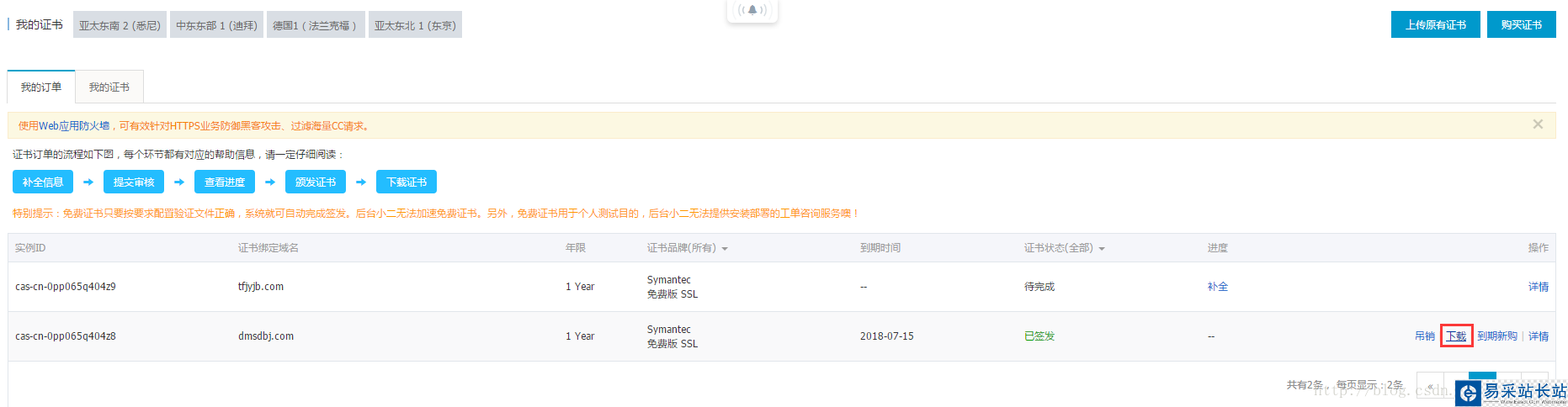1. 配置SSL模塊首先需要CA證書,CA證書可以自己手動頒發(fā)也可以在阿里云申請,本人在阿里云上申請的證書。(手動頒發(fā)可參考文章底部鏈接)
