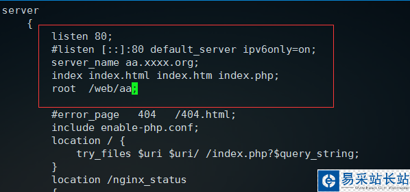 如果我們想綁定多個域名怎么辦,或者是各種二級域名,比如hao.、tools.這樣的二級域名;首先還是將域名解析到服務器,然后整體復制上面server{}代碼段重復粘貼到下面即可,這樣構造出多個server就是多站點配置了,注意要復制全,大括號要對稱,并且shell腳本中大括號和前面的語句之間必須有空格或者換行,這個很重要比如server { 或者if () {等一定要注意,其他的都很容易理解;當然很多集成包中會在和配置文件nginx.conf同目錄下設置一個vhost這樣的代碼虛擬主機的目錄,對于綁定多個域名設置多個配置文件,比如aa.conf、bb.conf這些文件,然后在nginx.conf使用include vhost/*.conf;全部引入,引入相當于所有代碼寫在nginx.conf中一樣,并且不用考慮其他目錄的關系,都以nginx.conf為準,這樣方便管理,比如aa.conf;