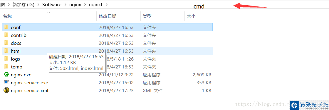 5. 打開cmd 通過命令行 切換自己的nginx文件目錄下面 或者直接在nginx 輸入cmd