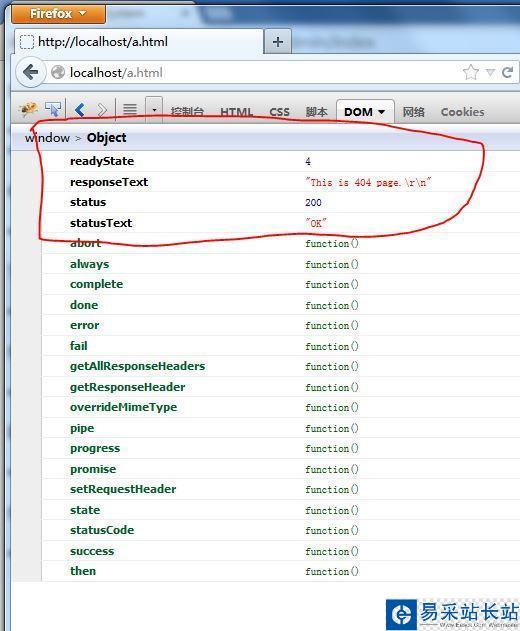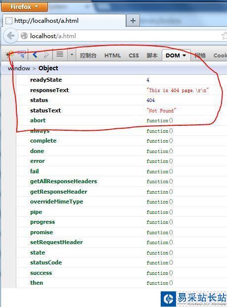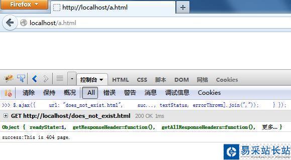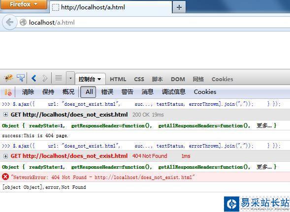 $.ajax({ url: "does_not_exist.html", success : function(Response, textStatus){ console.log(textStatus+":"+Response); }, error : function(XMLHttpRequest, textStatus, errorThrown){ console.log([XMLHttpRequest, textStatus, errorThrown].join(",")); }});執行結果: