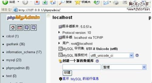 (你這時候會看到IE的地址為:http://127.0.0.1/phpmyadmin,所以,如果你熟練之后,你也可以直接輸入這個網址,那么就直接進入這個界面了。)這個界面用于創建數據庫,在“創建一個心的數據庫”下,輸入數據庫名字,在此我用study,點擊“創建”,就study數據庫就創建成功了。創建完之后,我們就完成任務了。這個界面以后基本就用不到了。