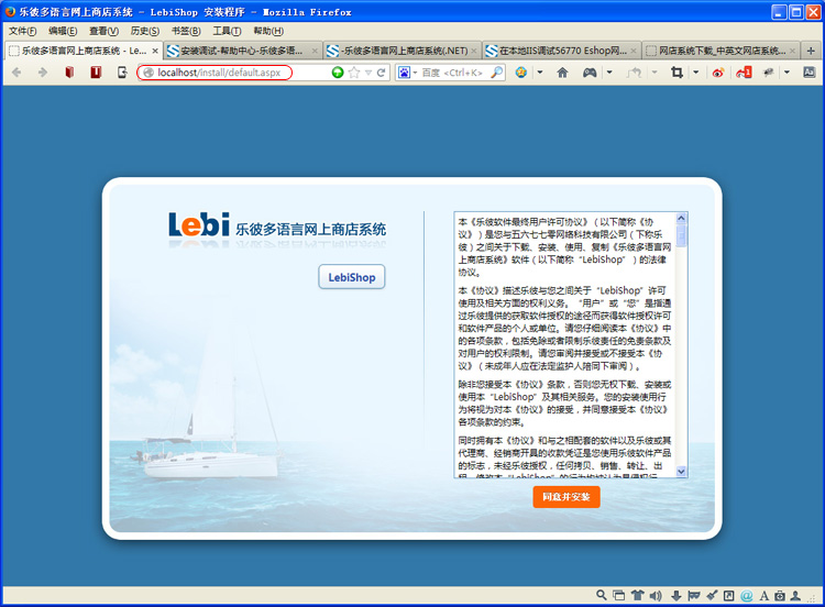 打開瀏覽器,在地址欄上輸入http://localhost/install/default.aspx,訪問LebiShop安裝向導。