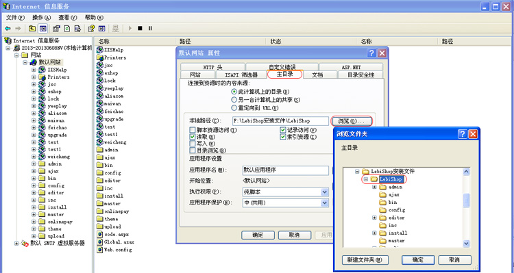 點擊主目錄選項卡,在本地路徑后面點擊瀏覽按鈕,選擇之前解壓在F盤的LebiShop程序,選中LebiShop文件夾。