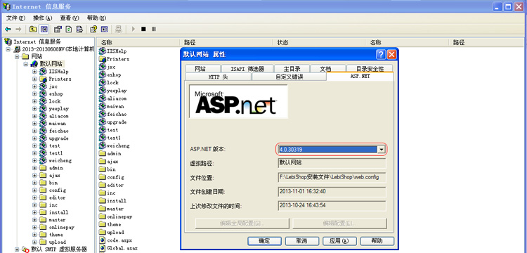 點擊ASP.NET選項卡,查看ASP.NET版本是否為4.0版本,如果非4.0版本點擊選擇4.0版本,如果沒有4.0版本選項需要在本地電腦中安裝Microsoft .NET Framework 4.0。