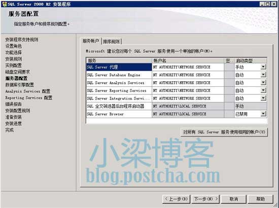 對于SQL的服務帳戶,我都用得是NETWORK SERVICE帳戶,方便管理使用,