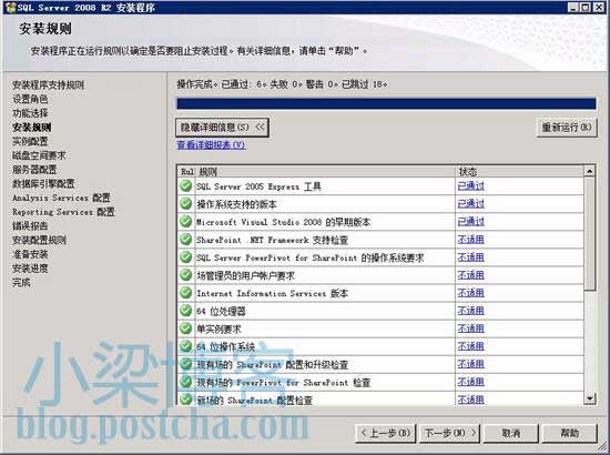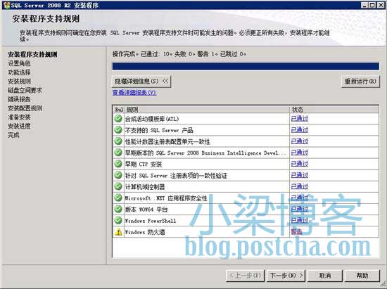 “安裝程序支持規則”頁,前面都是綠色的勾表示都通過了,直接“確定”即可,