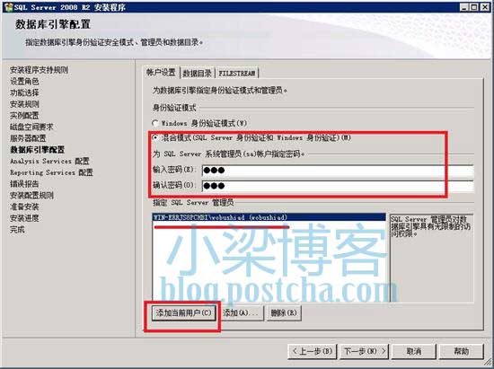 我們的SQL是用來做網站數據庫的,所以推薦使用“混合模式”,并給sa帳戶設置一個密碼,密碼需符合復雜性要求。并添加當前用戶為數據庫管理員帳戶。